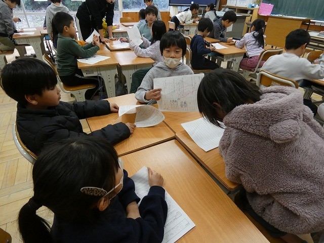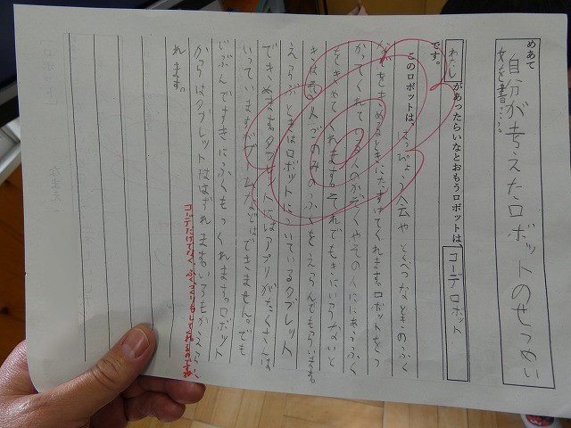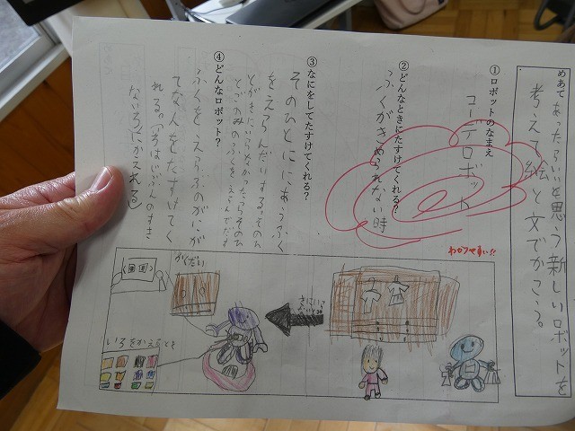 自分が考えたロボットを絵や文にして表し、伝え合っていました。