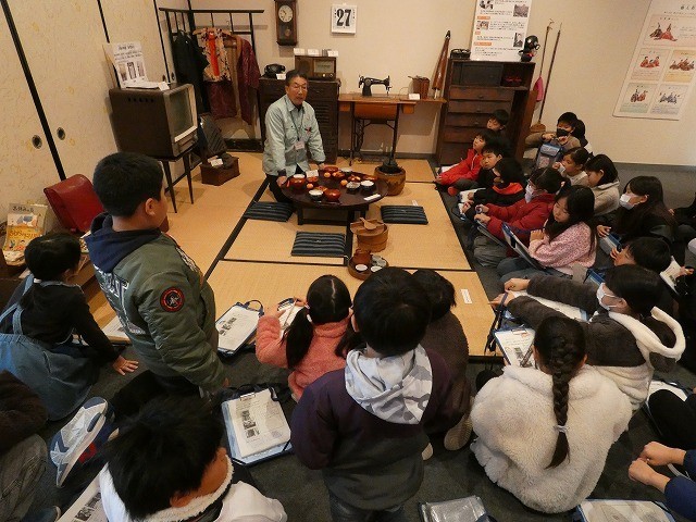 子どもたちは、江戸時代や明治、大正、昭和のひな祭りを見学するとともに、知多市の昔の様子や道具について理解を深めることができました。