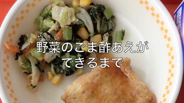 また、今日は栄養教諭が作成した「野菜のごま酢あえ」ができるまでの動画を各学級で視聴しました。