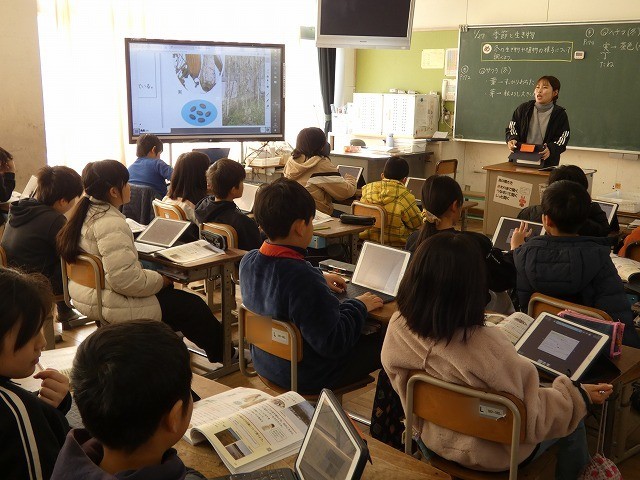 電子黒板に器具の組み立て方の動画を流し、全員が同じ活動ができるようにしていました。