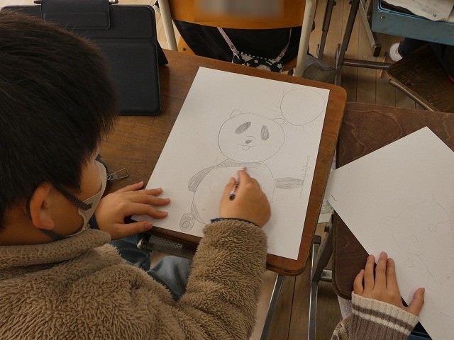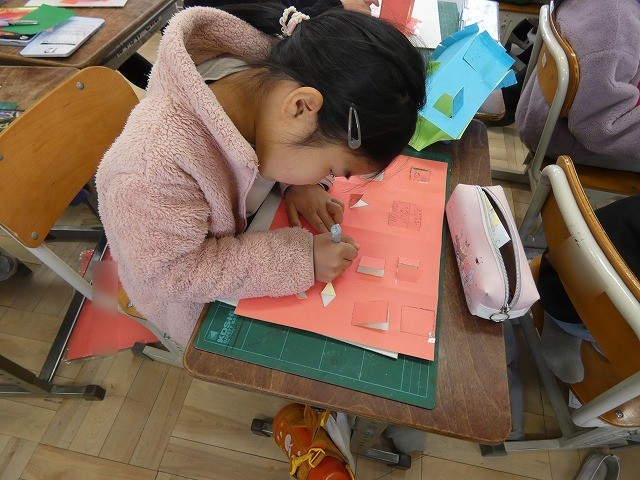 2年生がハート型マークの紙に、ペンで文を書いていました。