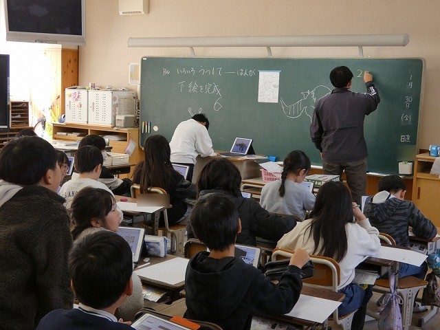 自分が表現した下絵を友達に見てもらい、アドバイスをもらっていました。