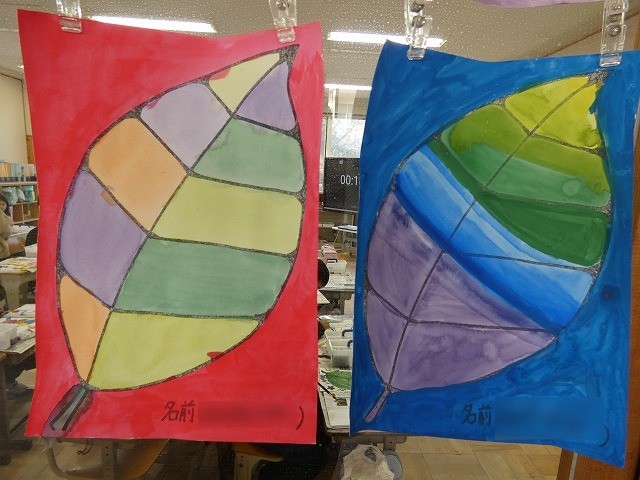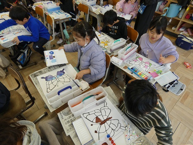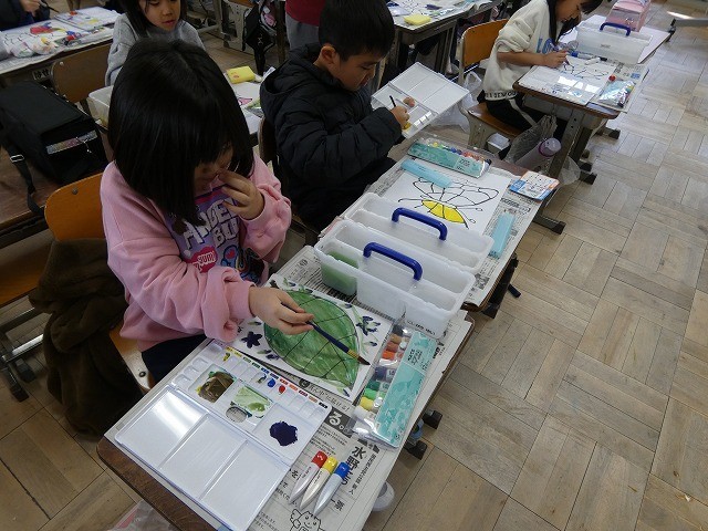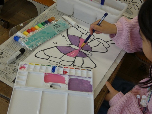 蝶々や葉っぱのイラストに、絵の具を使って色をつけていました。