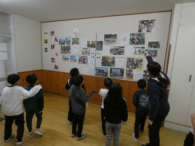 学年掲示板やこれまでの写真を見ながら、子どもたちはこの1年の自分自身の成長への気づきももてたようです。