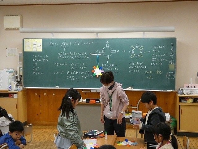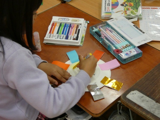 1年生がメダルを作っています。