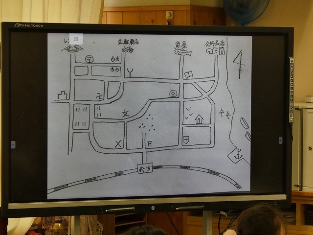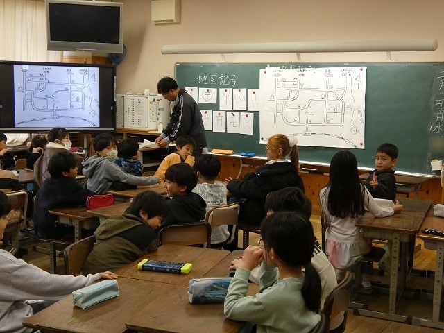 社会科の授業では、地図と地図記号を使って問題に挑戦していました。