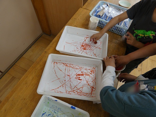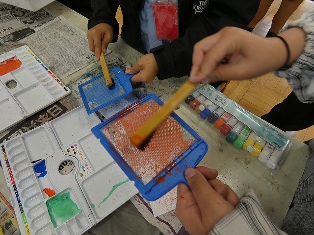 また、初めて使うローラー、ぼかし網、歯ブラシなどといった道具にも関心をもっている様子です。今後はこの単元で学習した技法を使って、絵画作品に取り組んでいってほしいと思います。 -