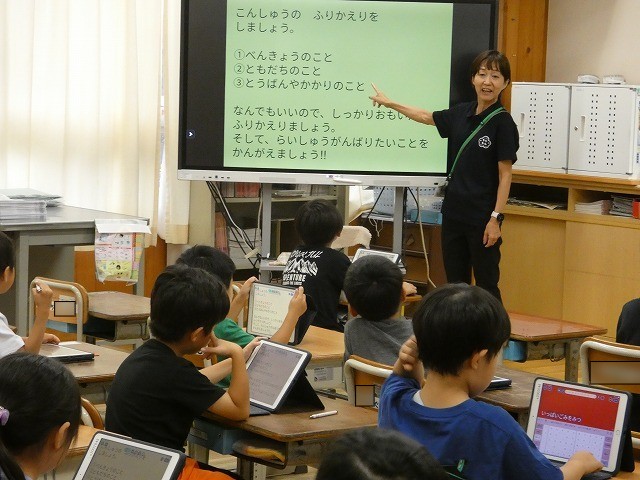 1年生が、タブレットを使って今週の振り返りをしていました。1年生もタブレットの操...
