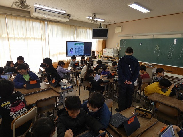 3年生がアプリを使って、クイズ大会をしていました。グループに分かれて、グループ内...