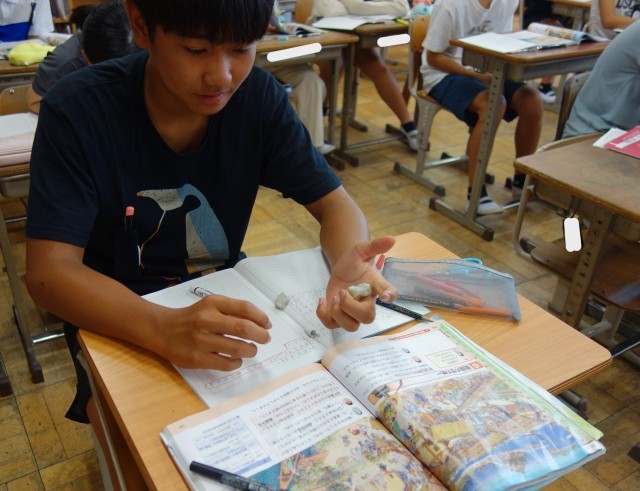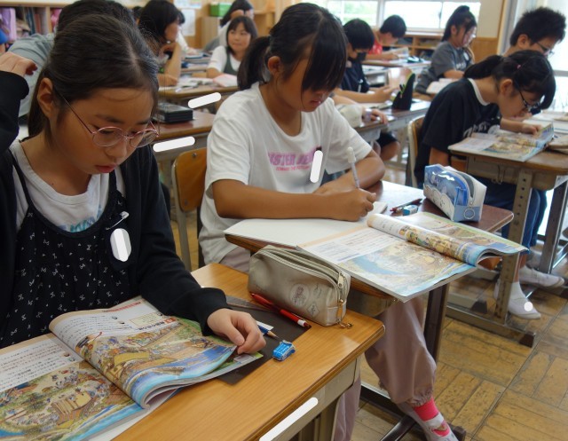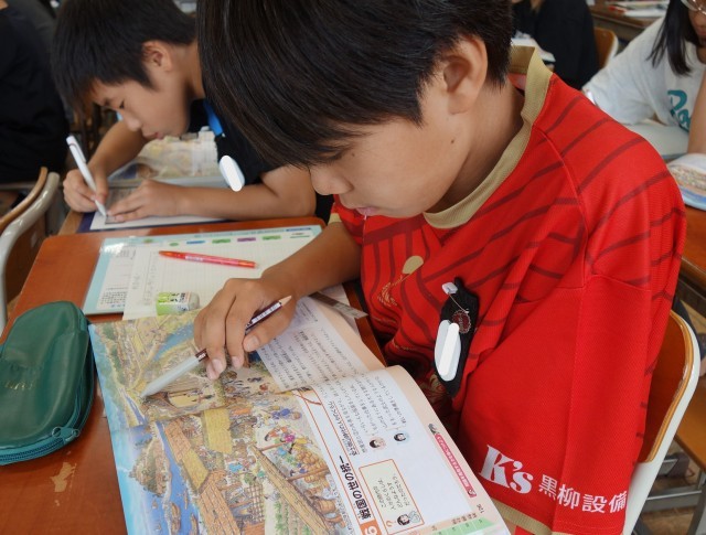 今日は、まちや人々の生活の様子が描かれた資料をみて、気づいたことを話し合っています
