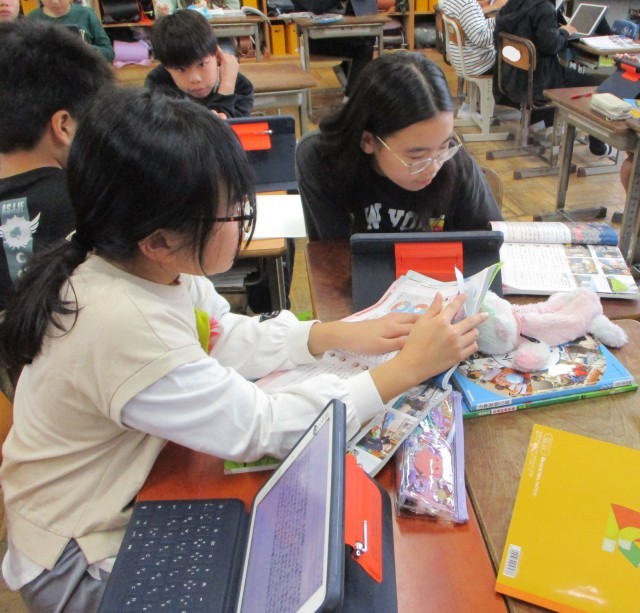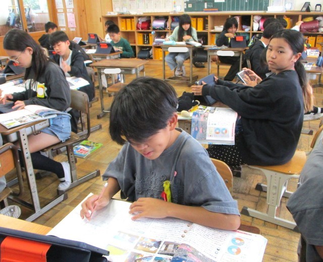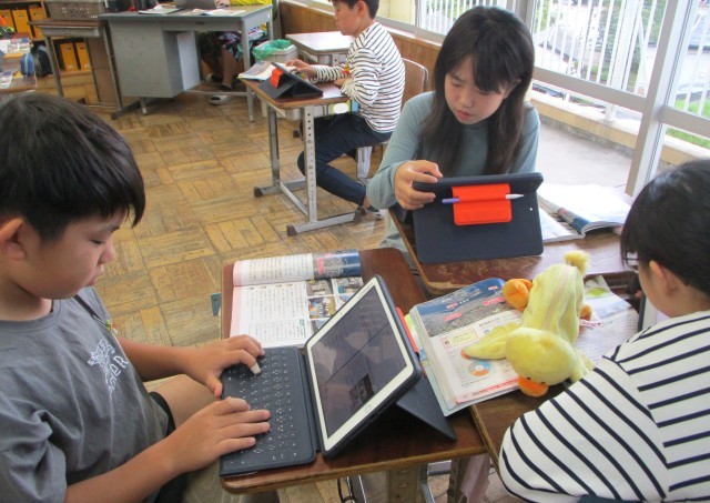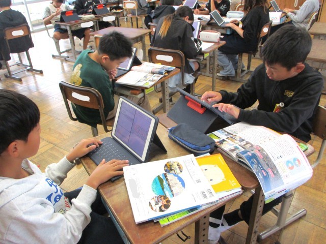 教科書にある情報から必要なものを取り出してまとめ、タブレットに入力しています。