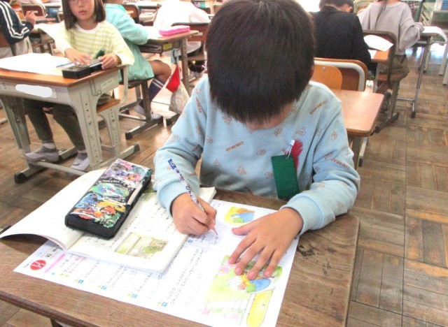 教科書を読んで、主語と述語に気をつけながら答えています。