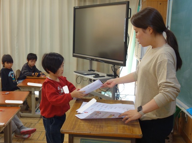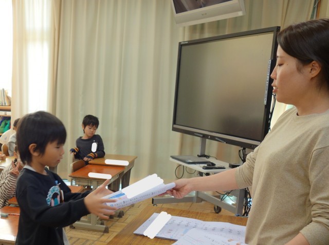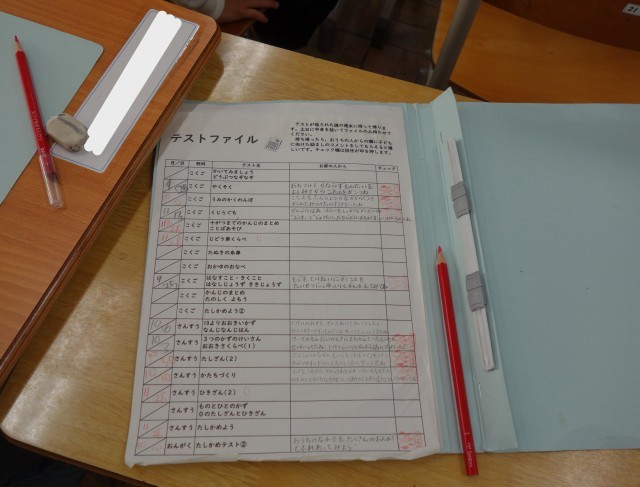 かえってきた テストは ファイルに とじて おうちのかたに みてもらいます