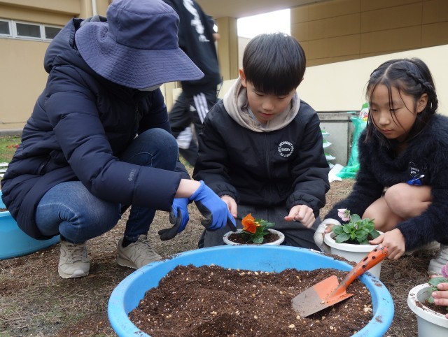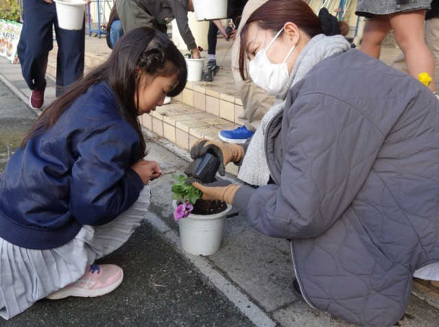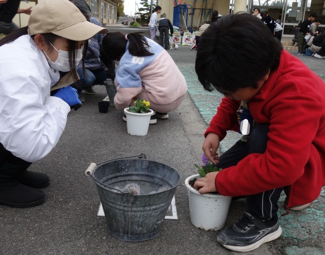 PTA施設部の呼びかけからご参加いただけた保護者ボランティアにお手伝いいただき、3年生が定植を行いました