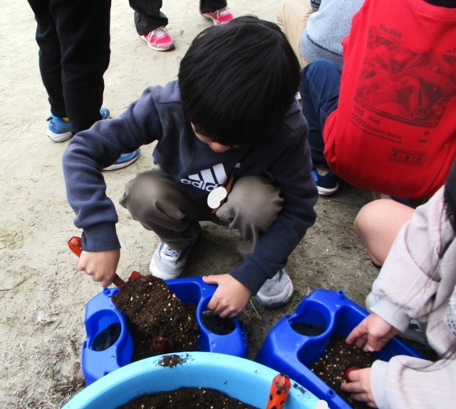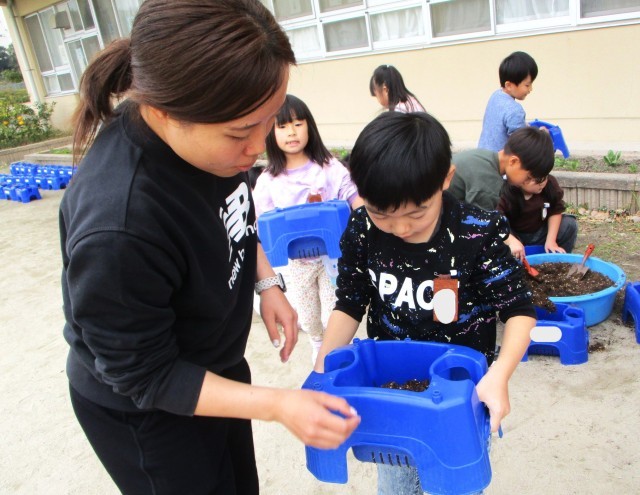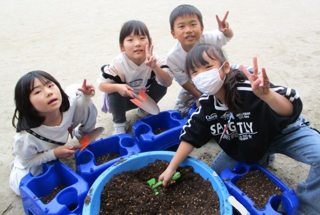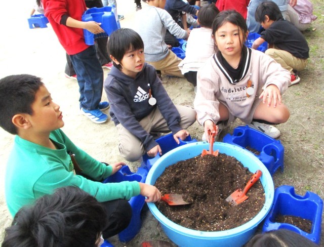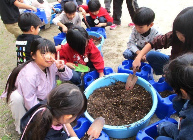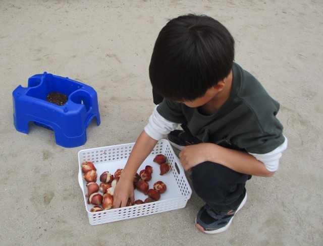 チューリップのきゅうこんを あさがおをそだておえたはちに うえました。