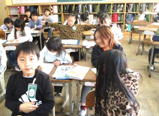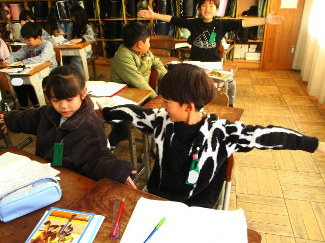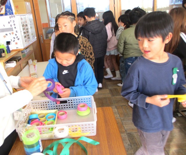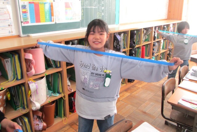 予想して、となりの子と協力して手をひろげたところで紙テープをちぎり、長さをはかりました。