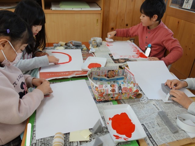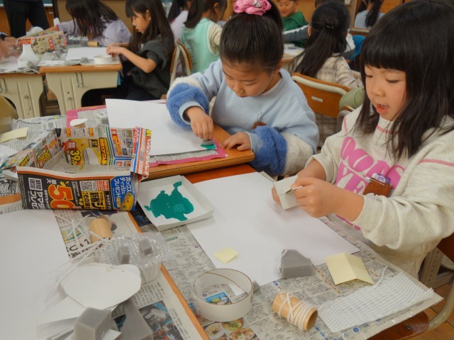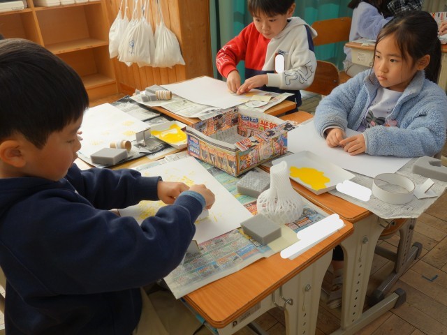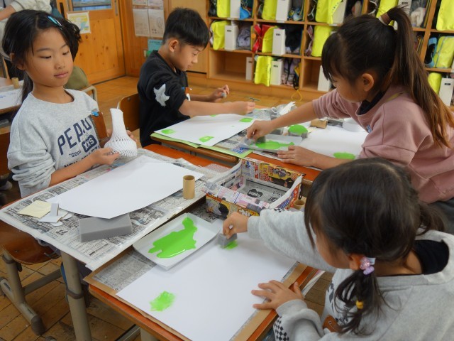スタンプのかたを つくって おしてみて いろいろなもようを つくっています