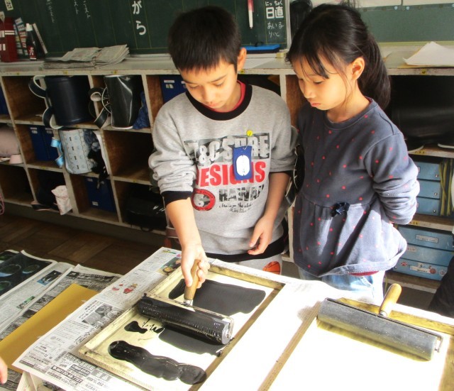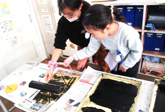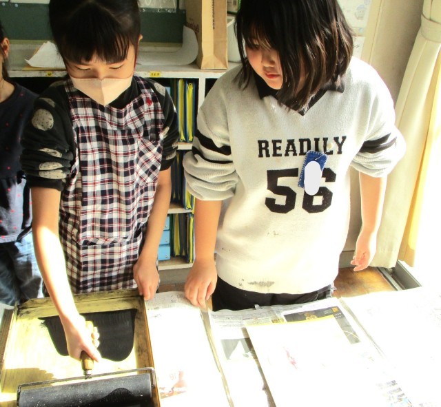 のばしたインクを版にぬり、版にかぶせた紙を上からこすって完成です。
