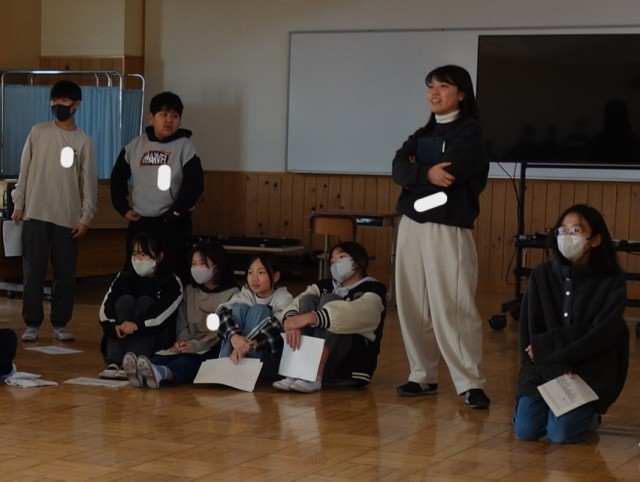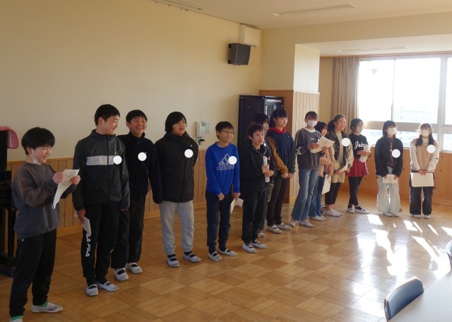 元気よくはっきりと返事の声が通るように、広い大ホールで声の出し方を練習しています
