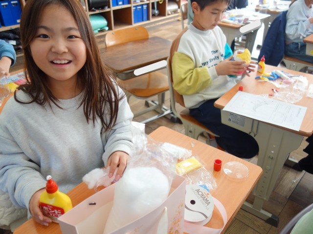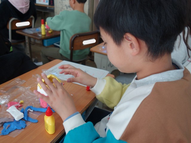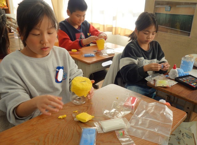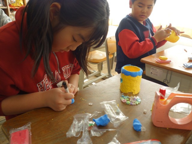 ペットボトルの空き容器に、紙粘土などを使って飾り付け、小物入れを作っています