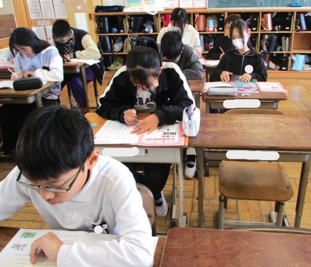 国語・算数・理科・社会、これまでに学んだ範囲の復習問題を解いています。
