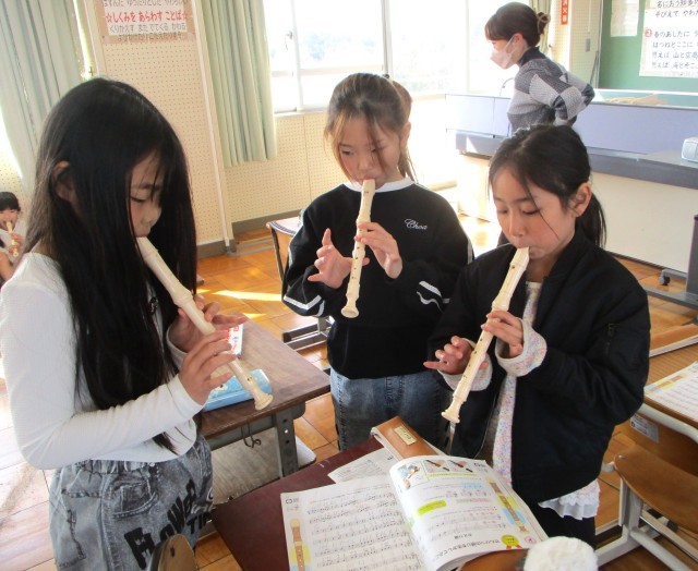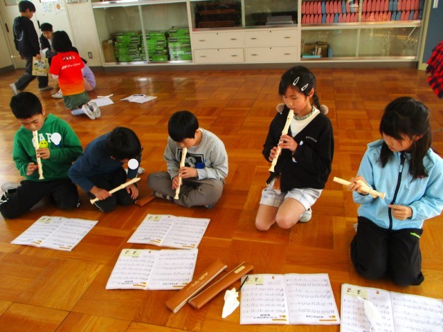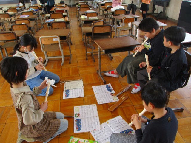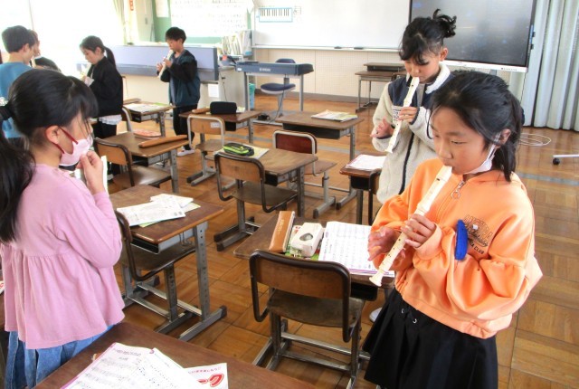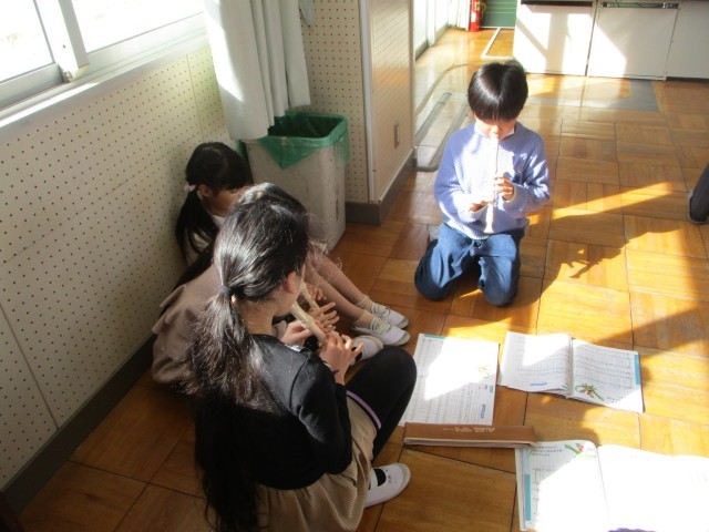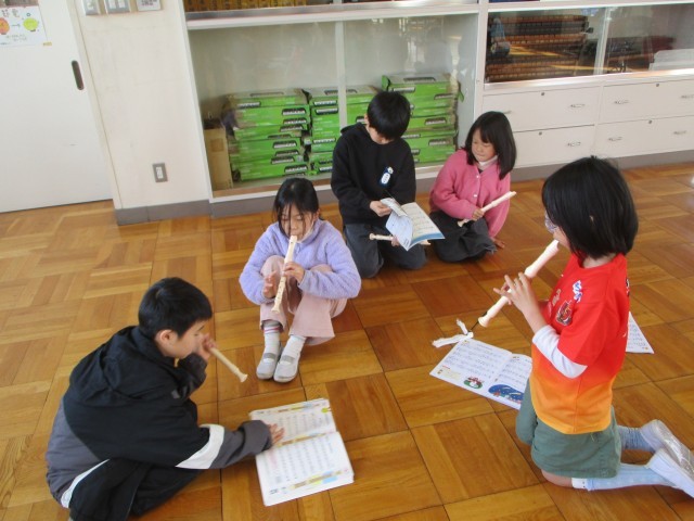 3年生で習った曲「せいじゃのこうしん」「ながれぼし」「メロンの気持ち」「レッツゴーソーレ」「マリオ」「パフ」の中から、グループで一曲選び、リコーダー発表をします。
