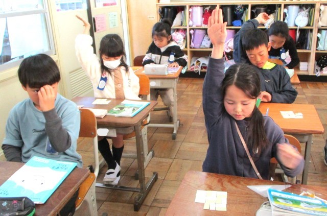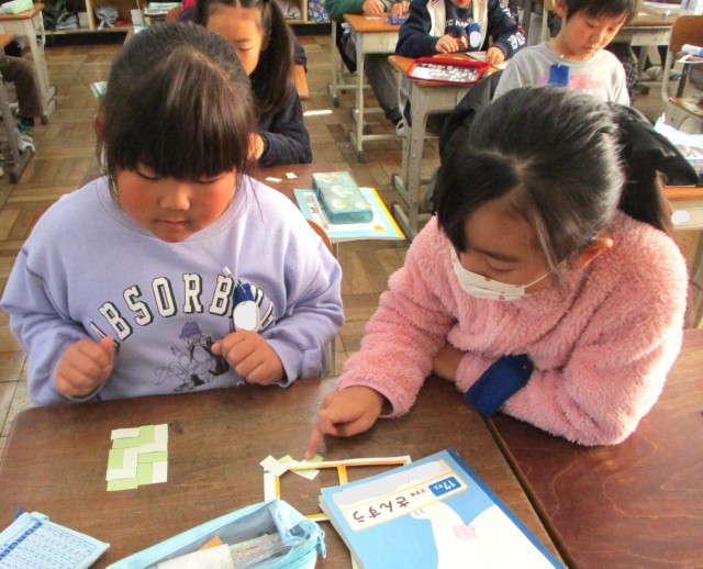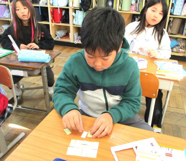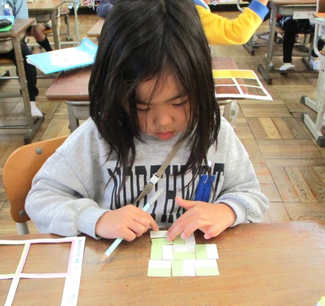 はじめは、教科書や電子黒板に示されたもようと同じもようを作ります。