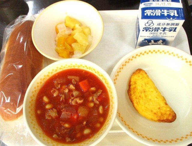 今日の給食は洋食メニューでした。ポークビーンズとミルクロールパン、ふんわりオムレツとデザートのナタデココポンチ。