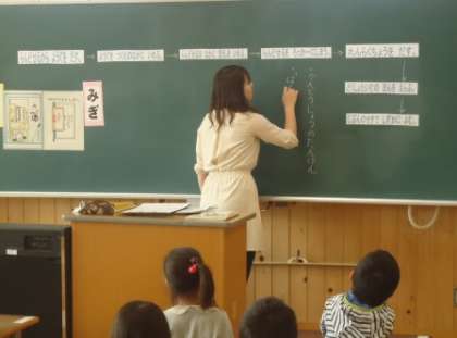 1年生での、朝の会の風景です。黒板に児童が整理する順番や日程を示し、児童が生活しやすくなるよう工夫しています