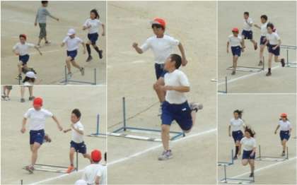 はじめは、ハードルを倒しておいて、跳ぶタイミングを練習しました。