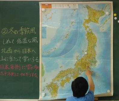日本の気候について学習をしています。季節風の影響を受け、地域により気候がことなることを学習しています。また、全クラス図工の上手な作品が飾れれています。さすが5年生!!