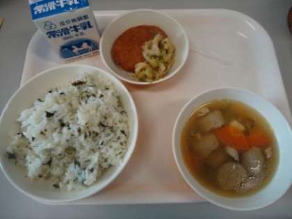 今日の献立は、つみれだんごじる コロッケ、おかか和え、わかめご飯、牛乳です。