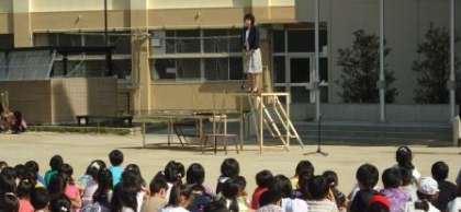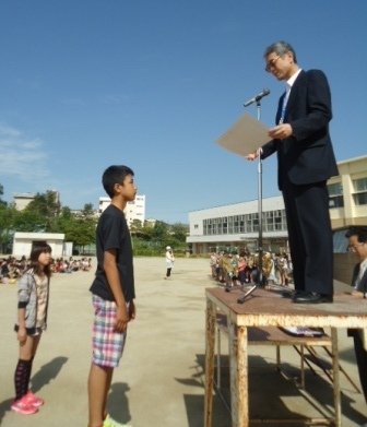 抜けるような青空の下、朝会が行われました。優良児童、バドミントン、少年野球、卓球の表彰に続き、養護教諭の伊藤先生からの講話がありました。伊藤先生からは同窓会での経験から、『校歌は大人になっても心に残る大切なもの』、『大人になっからも健康でいるために子どもの頃から「早寝」「早起き」「朝食」「運動」「歯磨き」に心掛けよう』という話がありました。最後は金管バンドクラブの演奏に合わせてしっかり退場をしていました。