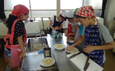 包丁の使い方の学習でしょうか、バナナをいろいろな大きさに切りました。そのバナナをきれいに盛りつけます。