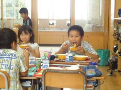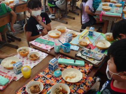 きちんと待ち、給食の開始です。もりもり食べています。たくさん食べて健康になりましょう