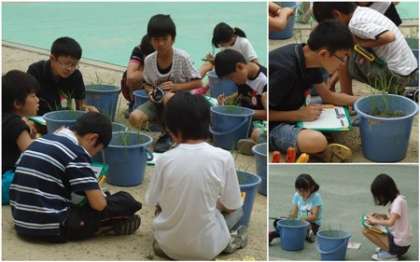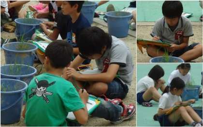 バケツに植えた稲が芽を出し、大きくなってきました。
