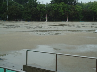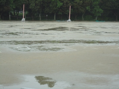 せっかくの運動会でしたが、雨天のため延期をさせていただきます。運動場も写真のように、各所に水たまりができている状態です。天気予報では、午前中も雨が降ったりやんだりの状況だそうです。降水確率も60%ということで、延期もやむを得ないと判断しました。今度は12日(木)の開催となります。よろしくお願いします。
