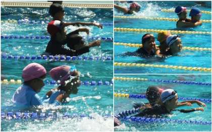 準備運動をした後、プールに入りました。おんぶをしてプールを歩いています。これも準備運動でしょうか。