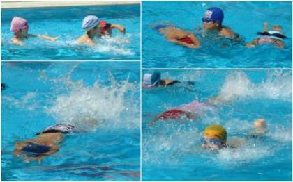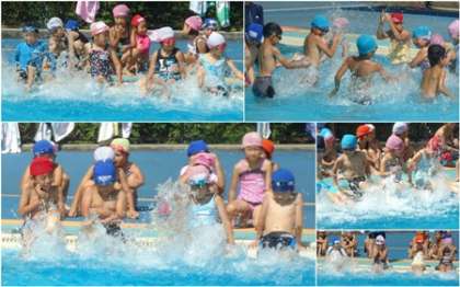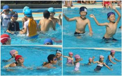 足をばたばたさせたり、水を掛け合ったりして水に慣れます。