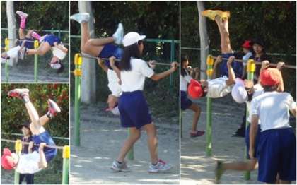すがすがしい空のもと、多くの学級が外で体育の授業をしていました。5年生は、鉄棒の逆上がりをしました。しばらくやってない間に、できなくなってしまった子もいます。けれども、タイミングの問題なので、一度できたことは練習すればすぐできるようになります。頑張りましょう。