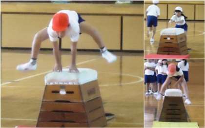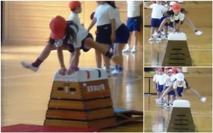 体育館で開脚跳びをしていました。