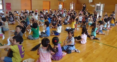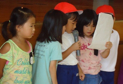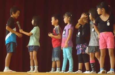 体育館で、1年生が「夏休みの思い出発表会」をしました。子どもたちは、夏休みにいろいろな経験をしました。それを発表したり、ゲームをしたりしました。司会も自分たちでしっかりできましたね。