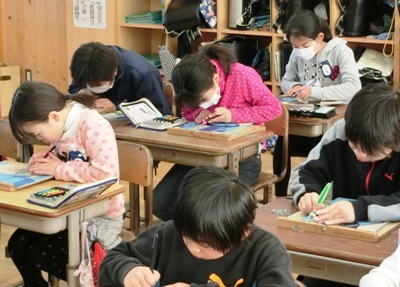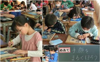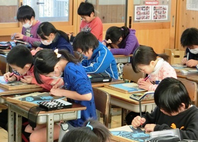 彫刻刀で彫るのもなかなか大変なようで、「疲れた〜」といっている子どももいました。でも、彫刻刀の使い方一つで、版画としてのできが違います。がんばりましょう。