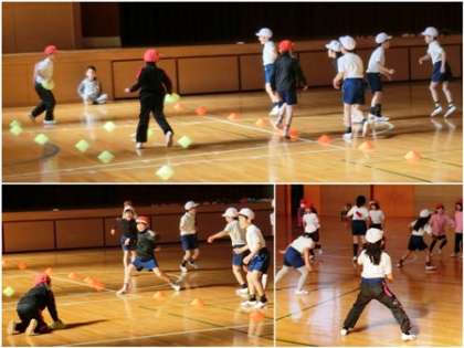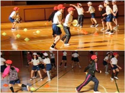 攻める側と守る側に分かれて、守る側の陣地にあるコーンを守る側の子どもにタッチされないようにとります。最初はとれましたが、数が少なくなるとなかなかとれませんでした。