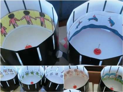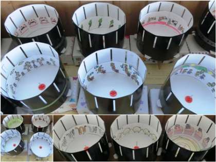 実は、黒くて円い筒を回転させ隙間からのぞくと、中の絵が漫画のように動いて見えるのです。みんな上手にできていましたね。