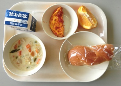 オムレツのトマトソースかけ、オレンジ、牛乳
