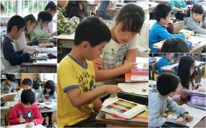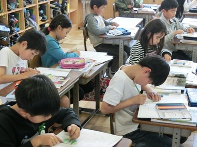 等高線が山の高さを表していることを学習しました。さっそく、白地図を使って、同じ高さの部分に色を塗りました。色をつけると高さがよりはっきりしますね。