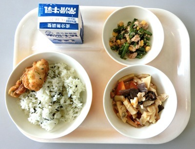 わかめごはん、タケノコの旨煮、インゲンとツナのごま和え