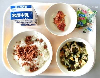 鶏肉のショウガ焼き、かしわもち、牛乳