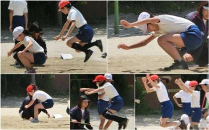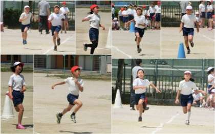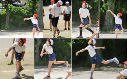 運動場で、立ち幅跳び、50メートル走、ボール投げをしました。